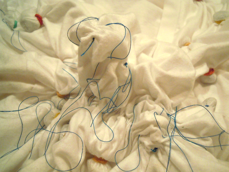 Once all the threads were knotted, I bound the gathered line around the elephant with a rubber band. This part is a bit tricky, in that you have to make sure all the gathers are pulled up, rather than hiding in gullies on the underside of the t-shirt.